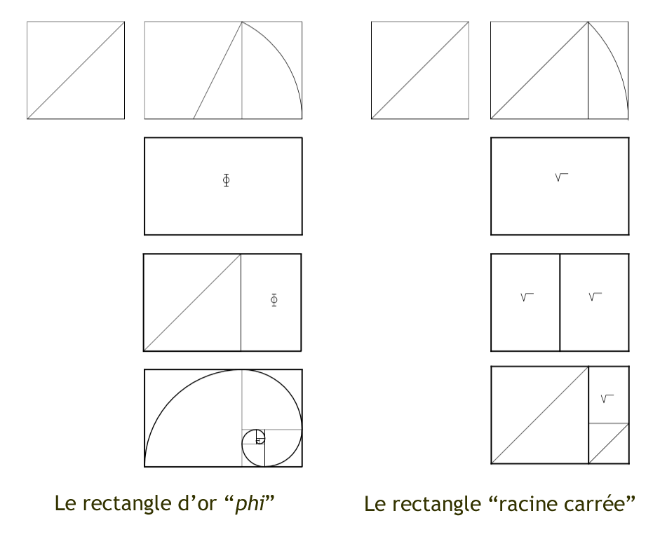 Le rectangle d’or (rectangle phi) est issu de la projection de la diagonale de la moitié du carré ; il se divise en un grand et un petit carré, et un autre rectangle phi, créant ainsi une série continue de rectangles et de carrés en proportion du nombre d’or. C’est la “divine proportion” dont Luca Pacioli fera un livre édité à Venise en 1509 et qui permet de construire la célèbre série de Fibonacci.